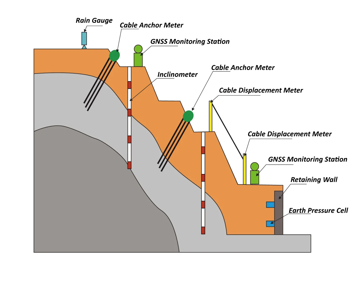 Ved å bruke høy presisjon og svært pålitelige overvåkingssensorer, overvåker den effektivt stabiliteten til skråninger. Gjennom kombinasjonen av overvåkingsdata og makroskopiske deformasjons- og feiltegn, blir det gjort omfattende vurderinger for å bestemme sikkerheten til skråningskonstruksjoner, og for å overvåke bæreevnen, driftsstatusen og holdbarheten til støttekonstruksjoner, etc., for å oppfylle kravene til sikker drift.